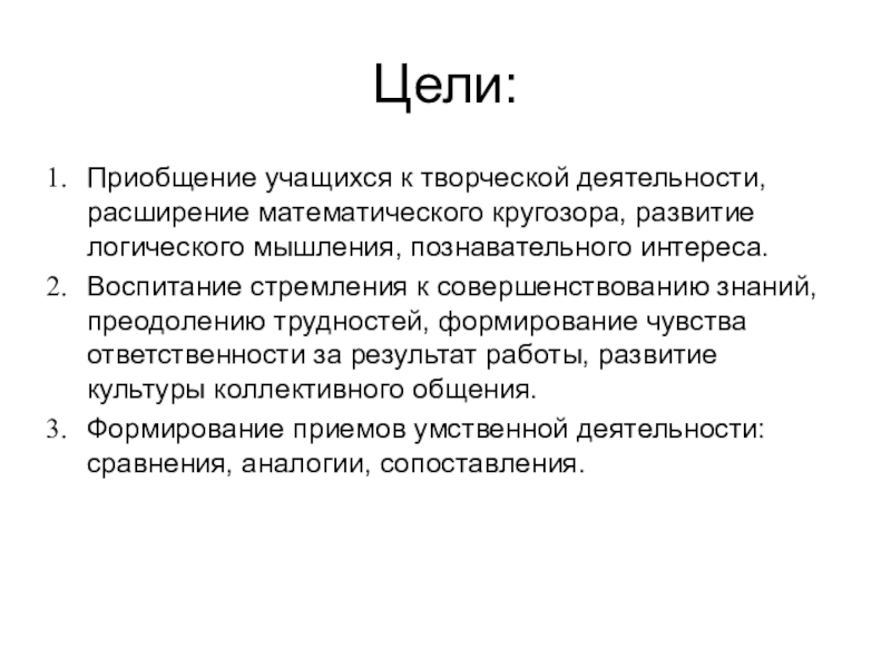 Приобщение учащихся к творческой деятельности, расширение математического кругозора, развитие логического мышления,