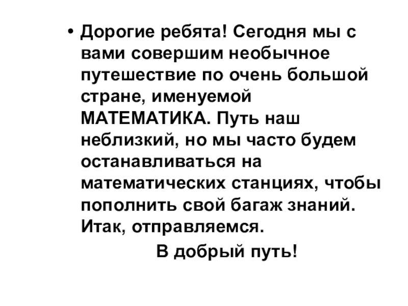 большой стране, именуемой МАТЕМАТИКА. Путь наш неблизкий, но мы часто будем останавливаться на математических станциях, чтобы пополнить свой багаж знаний. Итак, отправляемся.
