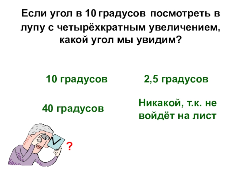 Слайд 9Если угол в 10 градусов посмотреть в лупу с четырёхкратным увеличением,