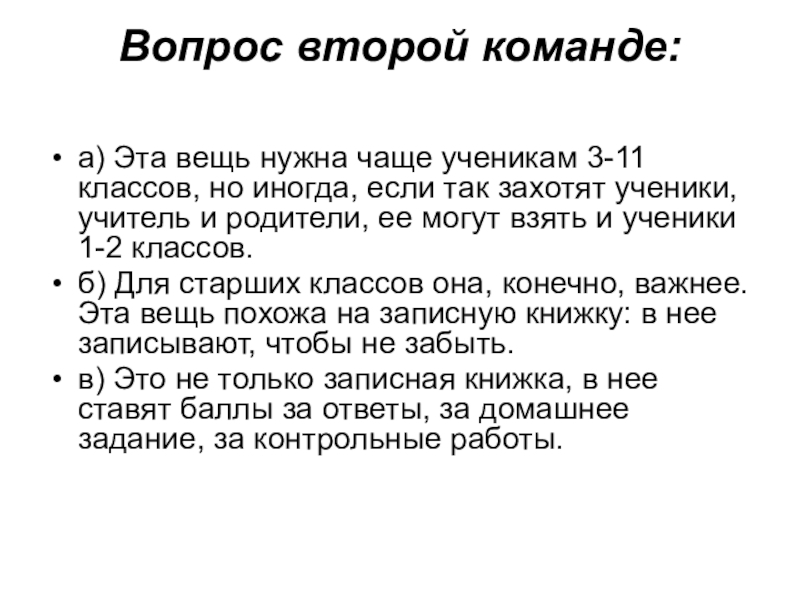 б) Для старших классов она, конечно, важнее. Эта вещь похожа на записную книжку: в нее записывают, чтобы не забыть.