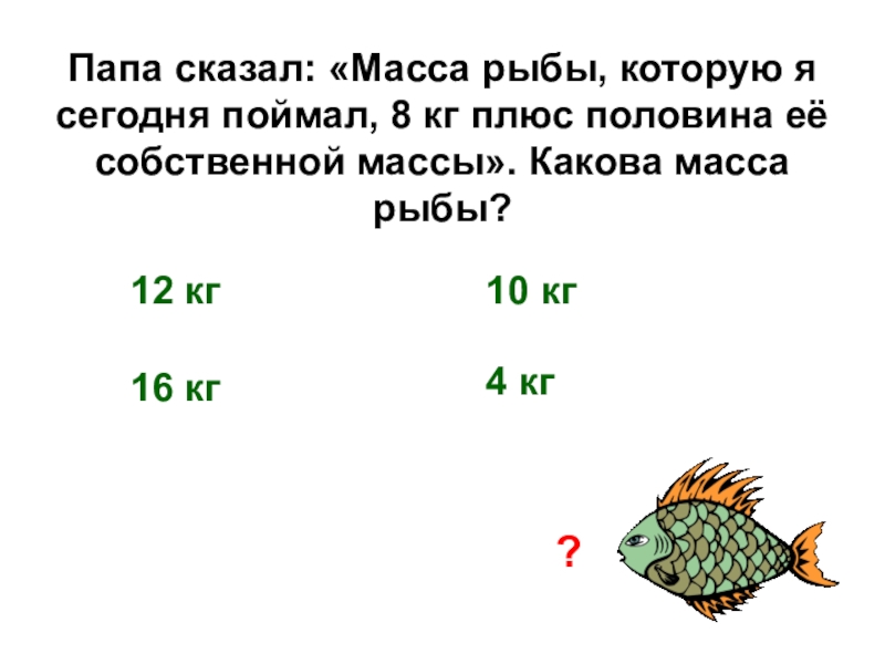 Слайд 11Папа сказал: «Масса рыбы, которую я сегодня поймал, 8 кг плюс