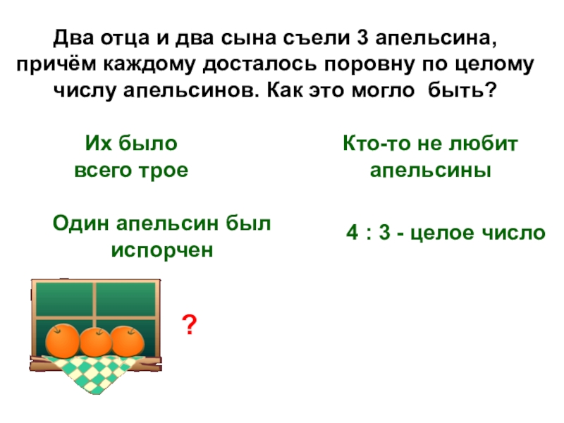 Слайд 12Два отца и два сына съели 3 апельсина,