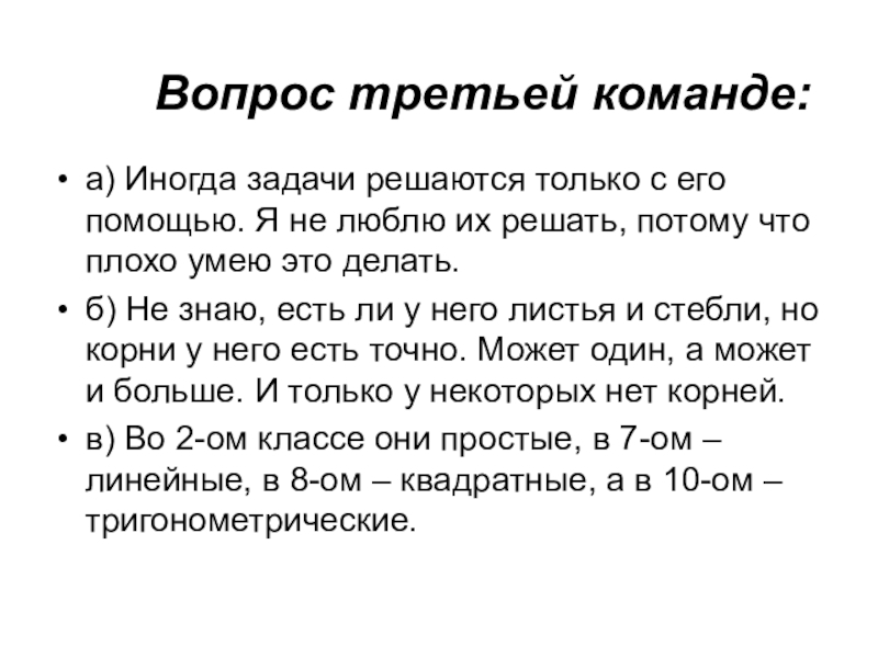 в) Во 2-ом классе они простые, в 7-ом – линейные, в 8-ом – квадратные, а в 10-ом – тригонометрические.