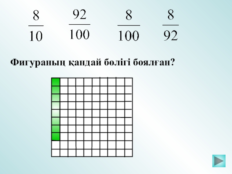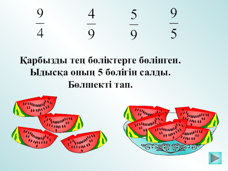 Қарбызды тең бөліктерге бөлінген. Ыдысқа оның 5 бөлігін салды. Бөлшекті тап.