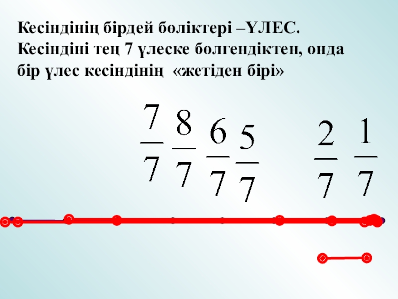 Кесіндінің бірдей бөліктері –ҮЛЕС.Кесіндіні тең 7 үлеске бөлгендіктен, ондабір үлес кесіндінің «жетіден бірі»