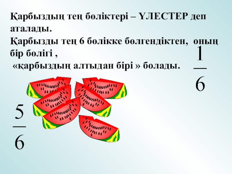 Слайд 5Қарбыздың тең бөліктері – ҮЛЕСТЕР деп аталады.