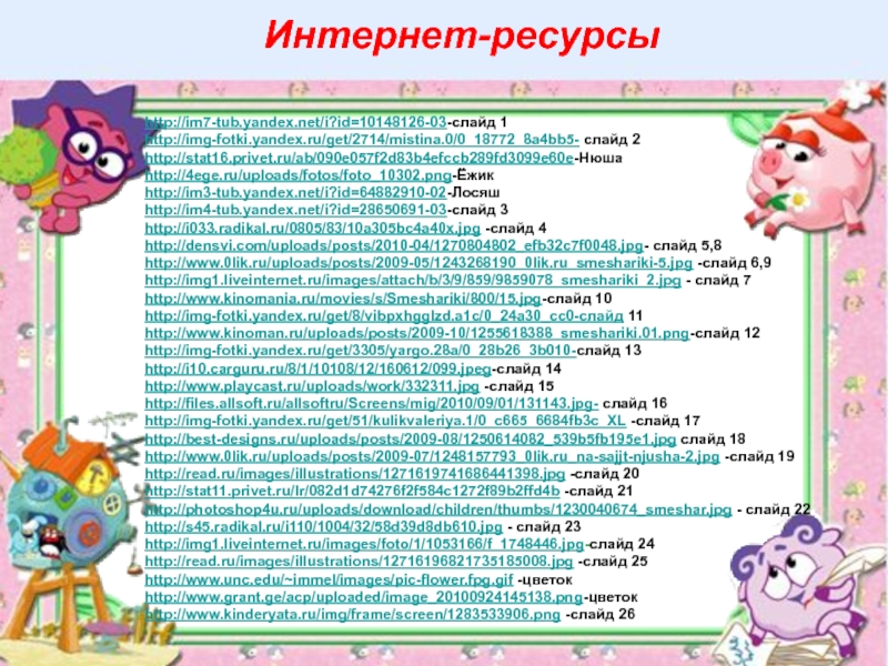 http://im7-tub.yandex.net/i?id=10148126-03-слайд 1http://img-fotki.yandex.ru/get/2714/mistina.0/0_18772_8a4bb5- слайд 2http://stat16.privet.ru/ab/090e057f2d83b4efccb289fd3099e60e-Нюшаhttp://4ege.ru/uploads/fotos/foto_10302.png-Ёжикhttp://im3-tub.yandex.net/i?id=64882910-02-Лосяшhttp://im4-tub.yandex.net/i?id=28650691-03-слайд 3http://i033.radikal.ru/0805/83/10a305bc4a40x.jpg -слайд 4http://densvi.com/uploads/posts/2010-04/1270804802_efb32c7f0048.jpg- слайд 5,8http://www.0lik.ru/uploads/posts/2009-05/1243268190_0lik.ru_smeshariki-5.jpg -слайд 6,9http://img1.liveinternet.ru/images/attach/b/3/9/859/9859078_smeshariki_2.jpg - слайд 7http://www.kinomania.ru/movies/s/Smeshariki/800/15.jpg-слайд 10http://img-fotki.yandex.ru/get/8/vibpxhgglzd.a1c/0_24a30_cc0-слайд 11http://www.kinoman.ru/uploads/posts/2009-10/1255618388_smeshariki.01.png-слайд 12http://img-fotki.yandex.ru/get/3305/yargo.28a/0_28b26_3b010-слайд