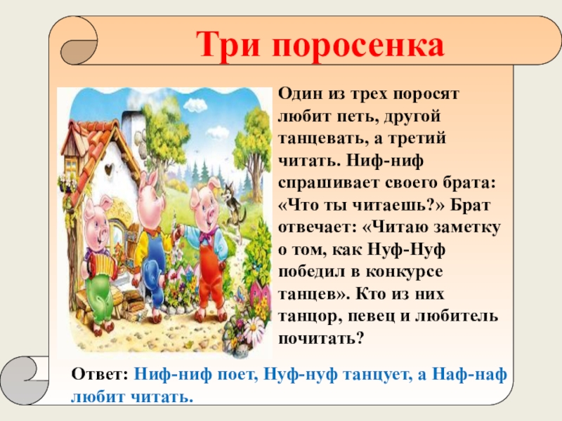 Ответ: Ниф-ниф поет, Нуф-нуф танцует, а Наф-наф любит читать.