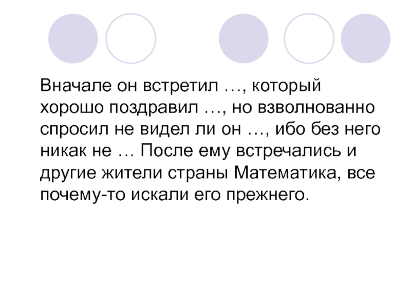 взволнованно спросил не видел ли он …, ибо без него никак не … После ему встречались и другие жители страны Математика, все почему-то искали его прежнего.