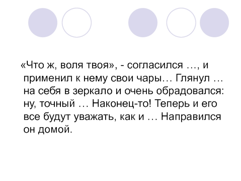 нему свои чары… Глянул … на себя в зеркало и очень обрадовался: ну, точный … Наконец-то! Теперь и его все будут уважать, как и … Направился он домой.