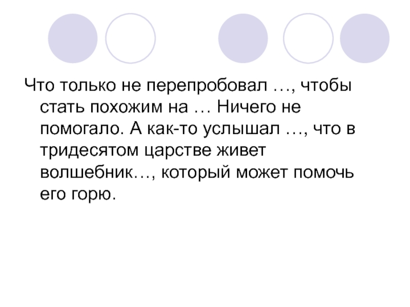 не помогало. А как-то услышал …, что в тридесятом царстве живет волшебник…, который может помочь его горю.