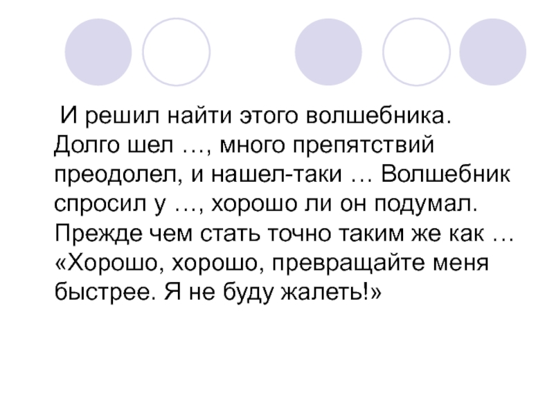 препятствий преодолел, и нашел-таки … Волшебник спросил у …, хорошо ли он подумал. Прежде чем стать точно таким же как … «Хорошо, хорошо, превращайте меня быстрее. Я не буду жалеть!»