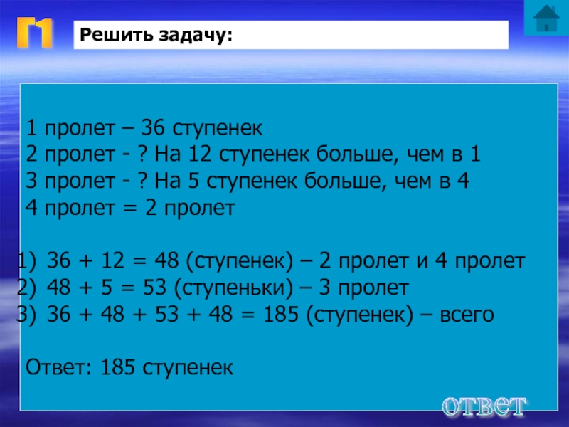 36 + 48 + 53 + 48 = 185 (ступенек) – всего