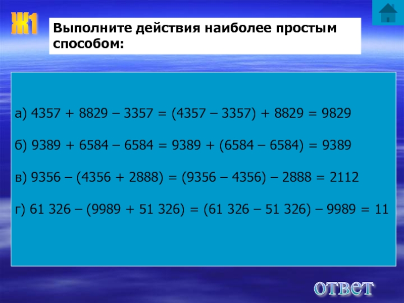 г) 61 326 – (9989 + 51 326) = (61 326 – 51 326) – 9989 = 11