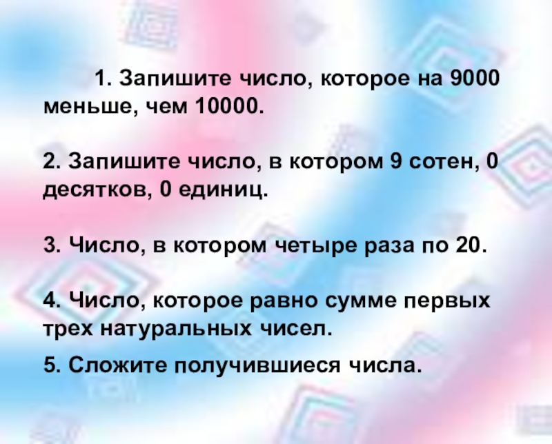 чем 10000. 2. Запишите число, в котором 9 сотен, 0 десятков, 0 единиц. 3. Число, в котором четыре раза по 20. 4. Число, которое равно сумме первых трех натуральных чисел. 5. Сложите получившиеся числа.