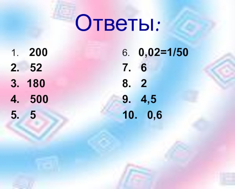 Ответы: 200 52 180 500 56.  0,02=1/507.  68.  29.  4,510.  0,6