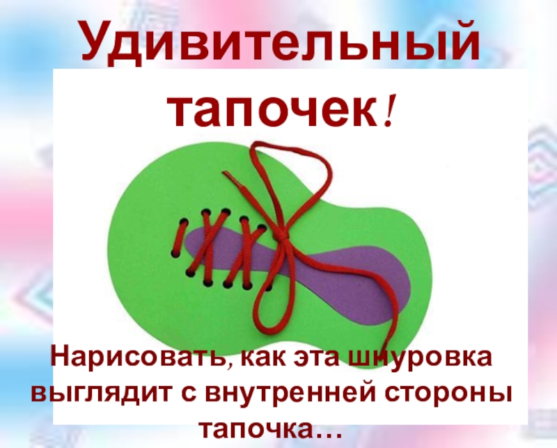 Удивительный тапочек!Нарисовать, как эта шнуровка выглядит с внутренней стороны тапочка…
