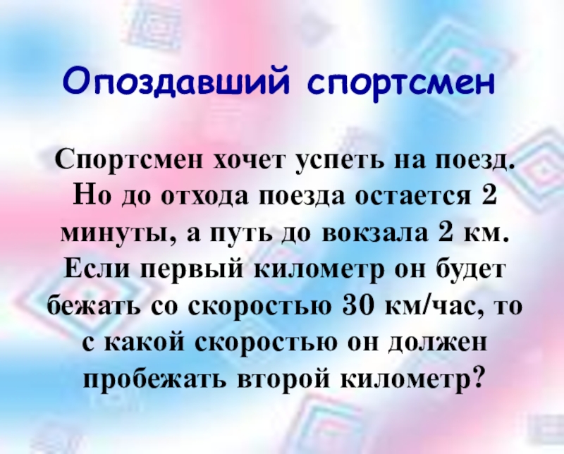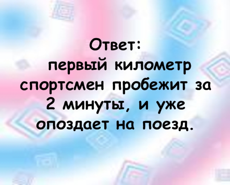 Слайд 17Ответ: первый километр спортсмен пробежит за 2 минуты, и уже опоздает