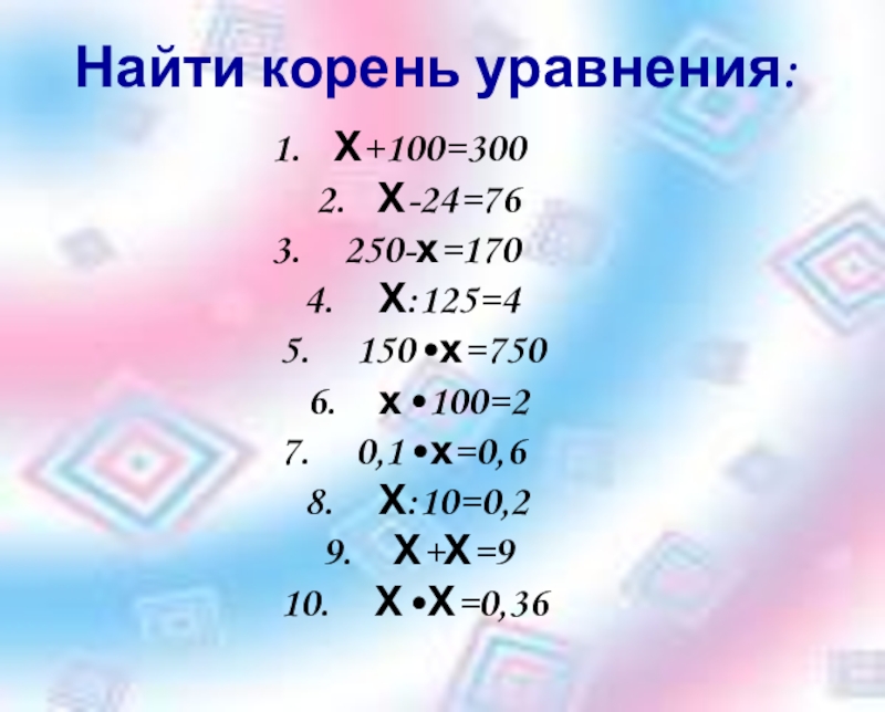 Найти корень уравнения: Х+100=300	 Х-24=76  250-х=170	4.	  Х:125=4	5.	  150•х=750	  х•100=27.	  0,1•х=0,6	8.	  Х:10=0,2