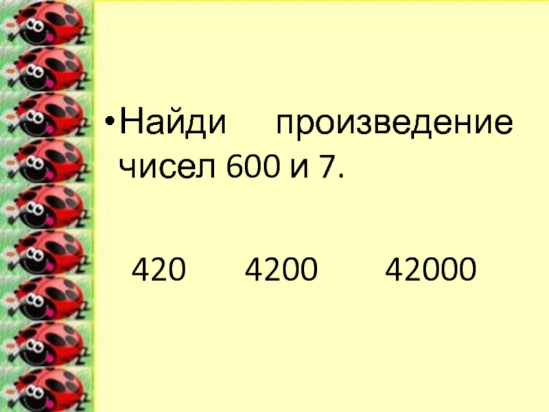 Найди произведение чисел 600 и 7.   420    4200    42000