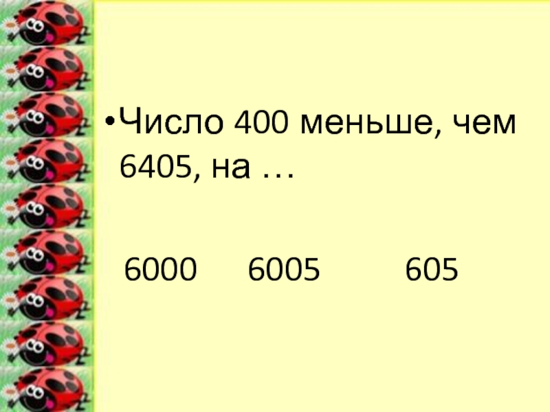 Число 400 меньше, чем 6405, на …  6000   6005     605