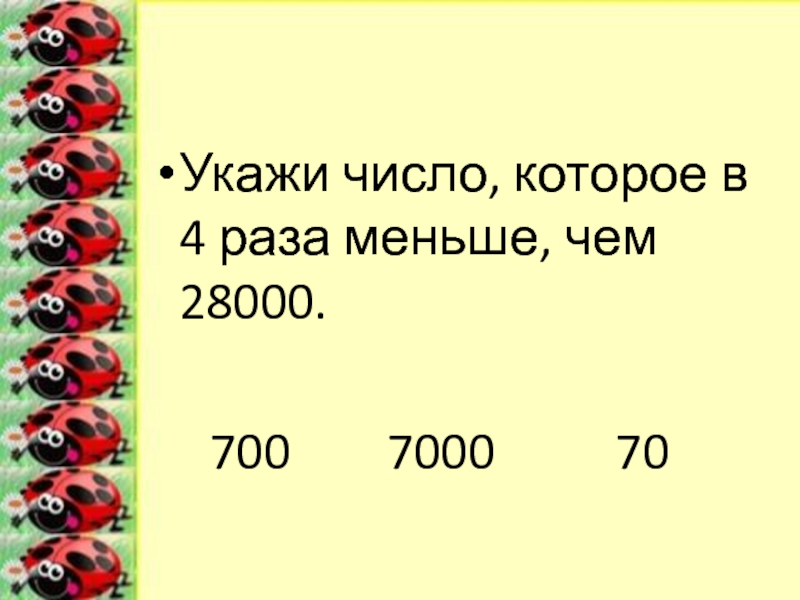 Укажи число, которое в 4 раза меньше, чем 28000.   700    7000