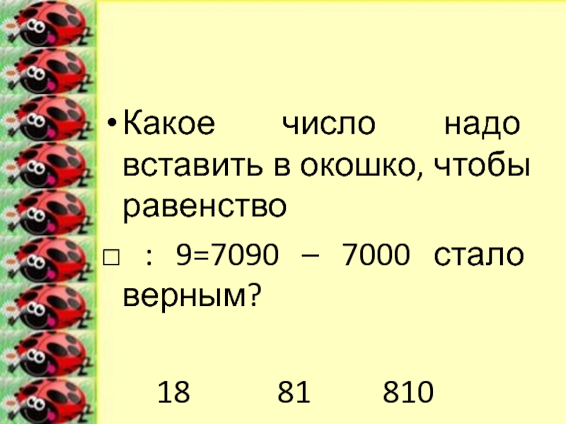 Какое число надо вставить в окошко, чтобы равенство □ : 9=7090 – 7000 стало верным?