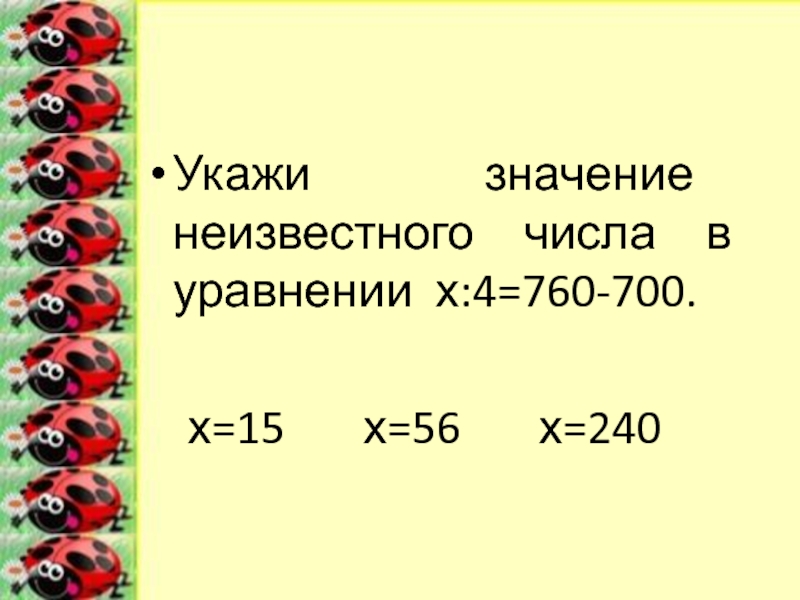 Укажи значение неизвестного числа в уравнении х:4=760-700.  х=15    х=56    х=240