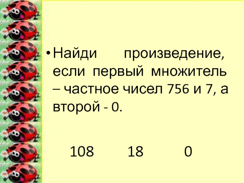 Найди произведение, если первый множитель – частное чисел 756 и 7, а второй - 0.