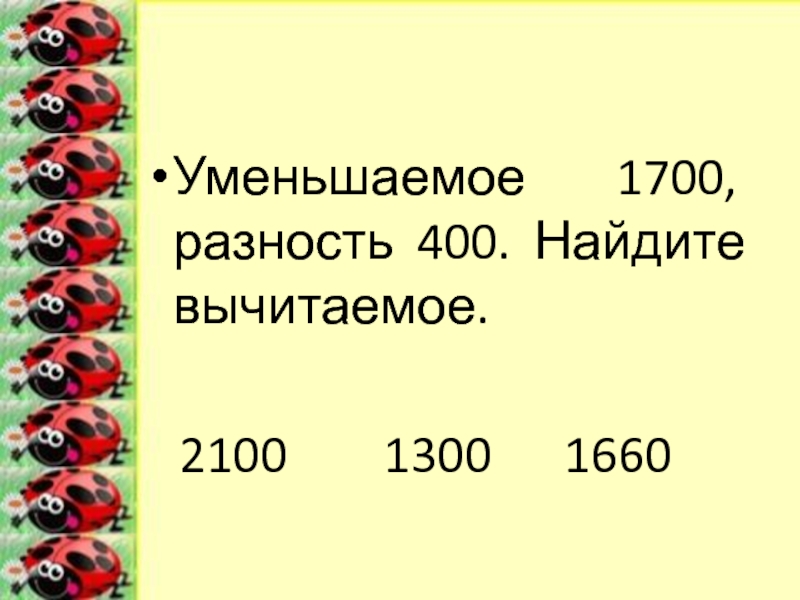 Уменьшаемое 1700, разность 400. Найдите вычитаемое.  2100    1300   1660