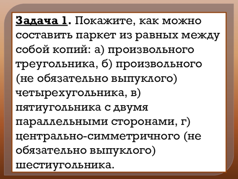 Плоскость можно покрыть копиями центрально-симметричного шестиугольника, или копиями пятиугольника с двумя параллельными сторонами. До сих пор не найдены все типы выпуклых пятиугольников, из которых складываются паркеты. Доказана теорема, утверждающая: «Нельзя сложить паркет из копий выпуклого семиугольника». Существуют паркеты из невыпуклых семиугольников.