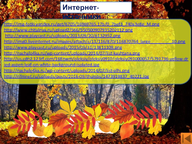 Интернет-источникиhttp://img-fotki.yandex.ru/get/6705/16969765.17b/0_7bef3_740a3e8e_M.pnghttp://www.chitalnya.ru/upload2/566/550500907935202112.png http://www.playcast.ru/uploads/2013/09/20/6132952.pnghttp://img0.liveinternet.ru/images/attach/c/11/116/870/116870764_large_________10.pnghttp://www.playcast.ru/uploads/2015/05/31/13811109.pnghttp://nachalo4ka.ru/wp-content/uploads/2014/07/list-kashtana.pnghttp://us.cdn2.123rf.com/168nwm/oleksiy/oleksiy0910/oleksiy091000057/5791736-yellow-dried-aspen-leaf-on-white-background-isolated.jpghttp://nachalo4ka.ru/wp-content/uploads/2014/07/list-olhi.pnghttp://rifmnet.ru/uploads/posts/2016-09/thumbs/1473919837_40221.jpg