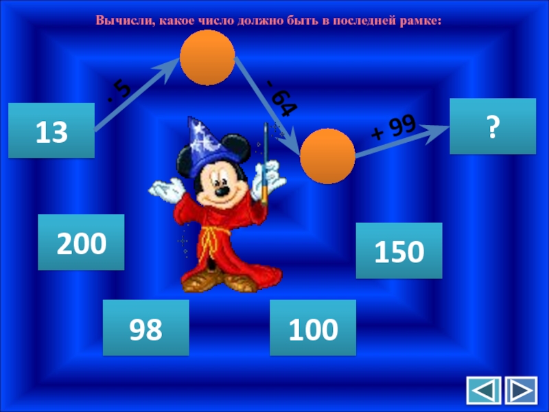 Вычисли, какое число должно быть в последней рамке:13?∙ 5- 64+ 9998100150200