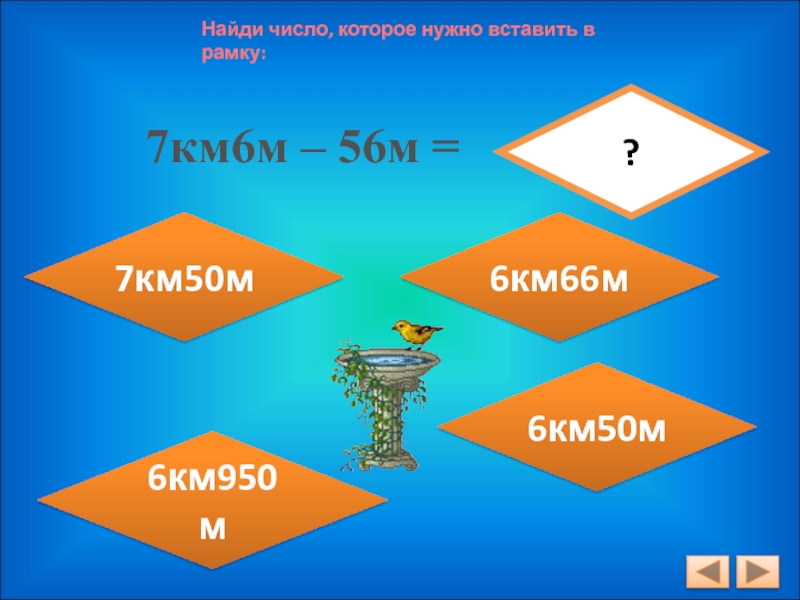 Найди число, которое нужно вставить в рамку:7км6м – 56м =?6км950м6км50м6км66м7км50м