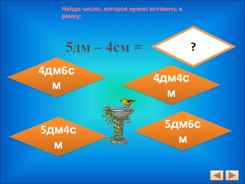 Найди число, которое нужно вставить в рамку:5дм – 4см =?4дм6см5дм6см4дм4см5дм4см