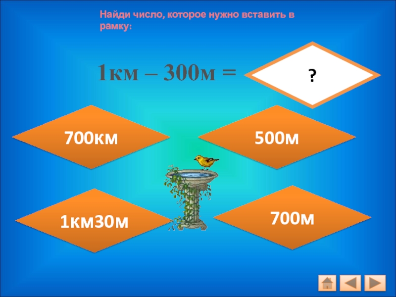 Найди число, которое нужно вставить в рамку:1км – 300м =?700м700км500м1км30м