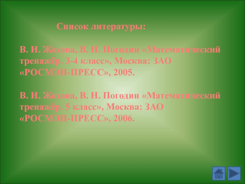 Список литературы:В. И. Жохова, В. Н. Погодин «Математический тренажёр. 3-4 класс», Москва: ЗАО«РОСМЭН-ПРЕСС», 2005.В. И. Жохова, В.
