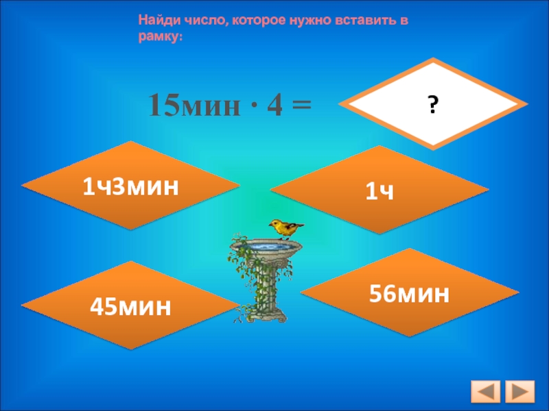 Найди число, которое нужно вставить в рамку:15мин ∙ 4 =?1ч56мин1ч3мин45мин
