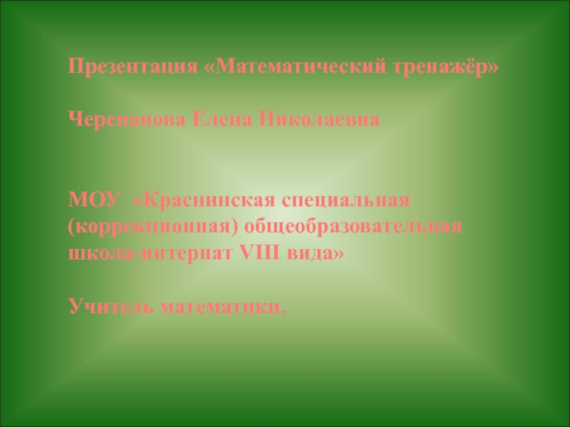 Презентация «Математический тренажёр»Черепанова Елена НиколаевнаМОУ «Краснинская специальная(коррекционная) общеобразовательная школа-интернат VIII вида»Учитель математики.