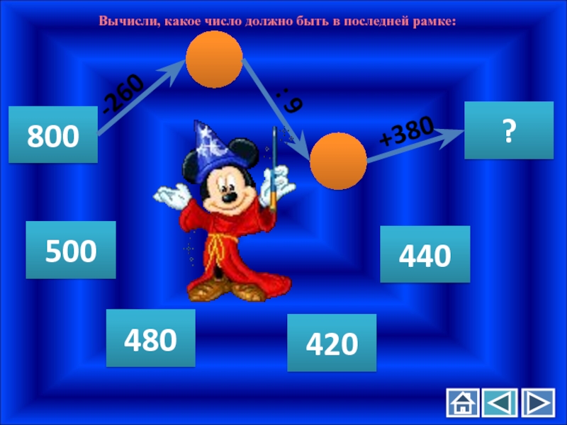 Вычисли, какое число должно быть в последней рамке:800?-260: 9+380480440500420