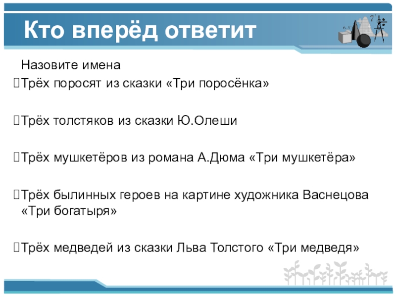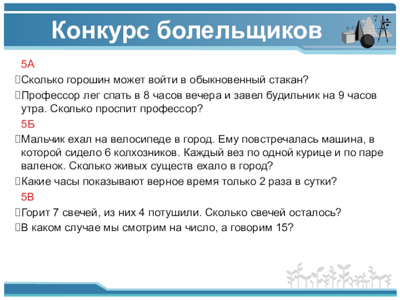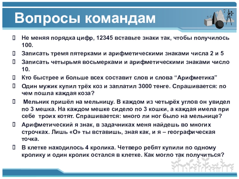 полбулки. Сколько весит целая булка? Какой цифрой заканчивается произведение всех чисел от 7 до 81? Летели утки – одна впереди и две позади, одна позади и две впереди, одно между двумя и три в ряд. Сколько всего летело уток?