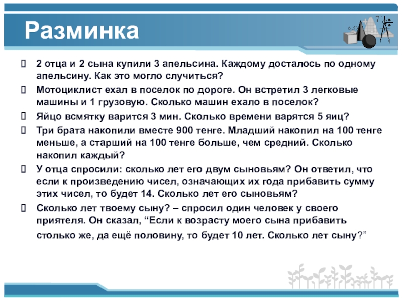 2 отца и 2 сына купили 3 апельсина. Каждому досталось по