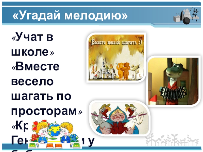«Учат в школе» «Вместе весело шагать по просторам» «Крокодил Гена»
