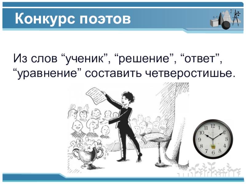 Из слов “ученик”, “решение”, “ответ”, “уравнение” составить четверостишье.