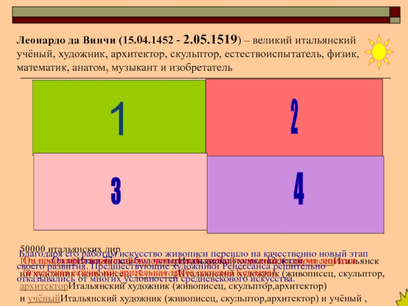 Леонардо да Винчи (15.04.1452 - 2.05.1519) – великий итальянский учёный, художник, архитектор, скульптор, естествоиспытатель, физик, математик, анатом, музыкант и изобретатель