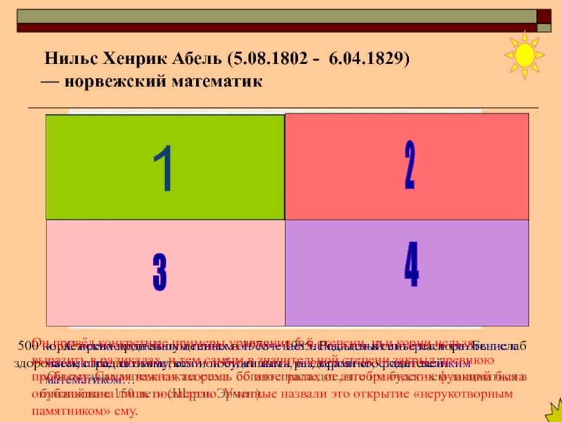 Он привёл конкретные примеры уравнения 5-й степени, чьи корни нельзя выразить в радикалах, и тем самым в значительной степени закрыл древнюю проблему. Самая важная теорема об интегралах от алгебраических функций была опубликована лишь посмертно. Ученные назвали это открытие «нерукотворным памятником» ему.