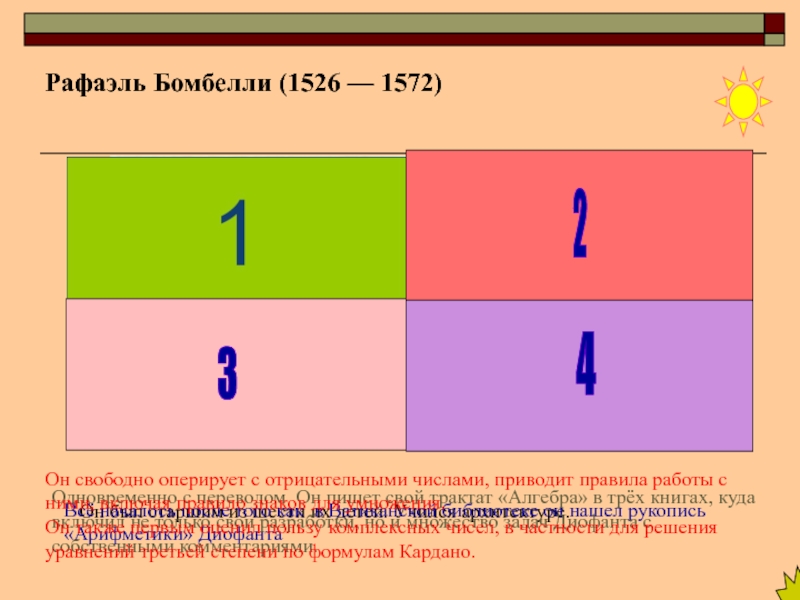 Он также первым оценил пользу комплексных чисел, в частности для решения уравнений третьей степени по формулам Кардано.