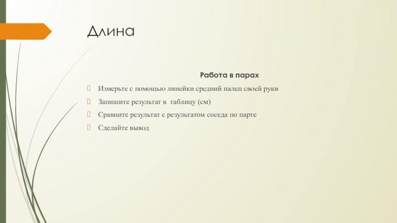 ДлинаРабота в парахИзмерьте с помощью линейки средний палец своей рукиЗапишите результат в таблицу (см)Сравните результат с результатом соседа по партеСделайте вывод
