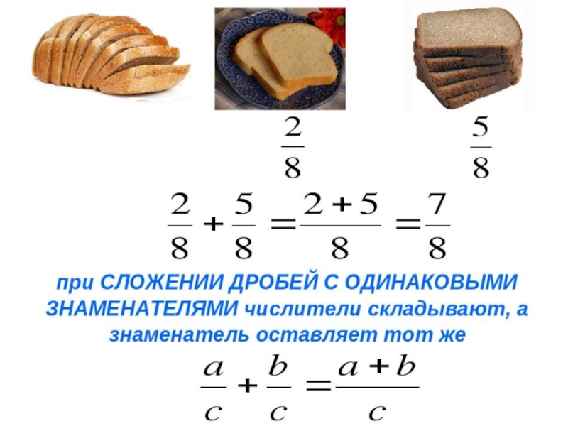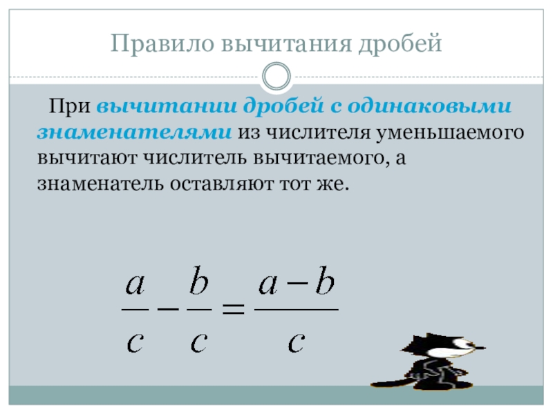 Правило вычитания дробей	При вычитании дробей с одинаковыми знаменателями из числителя уменьшаемого вычитают числитель вычитаемого, а знаменатель оставляют