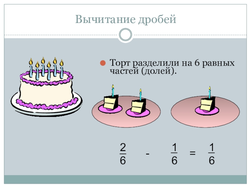 Вычитание дробейТорт разделили на 6 равных частей (долей).2616_-16_=_